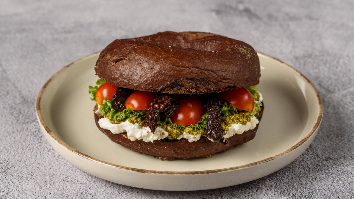 Bagel φτιαγμένο από χαρούπι, με pesto βασιλικού , λόλα, κρέμα ξινομυζήθρα, ντοματίνια και λιαστά ντοματίνια