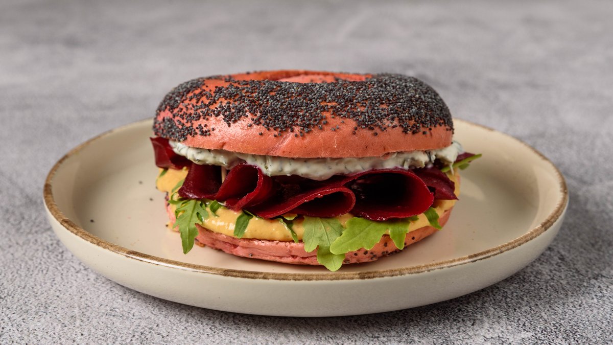 Bagel φτιαγμένο από παντζάρι, με χούμους, λόλα, μαριναρισμένο παντζάρι και sauce γιαουρτιού