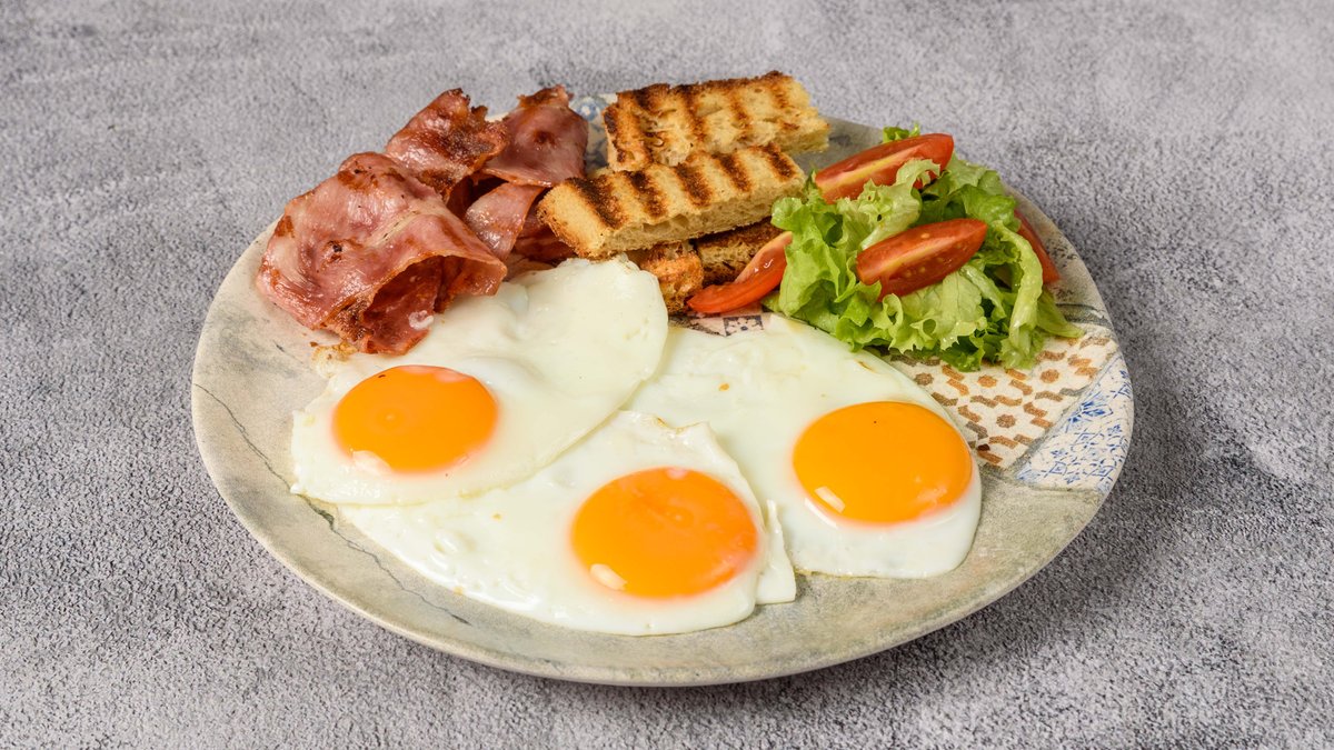 Τρία αυγά μάτια με τρεις φέτες bacon, πράσινη σαλάτα και φρυγανισμένο ψωμί