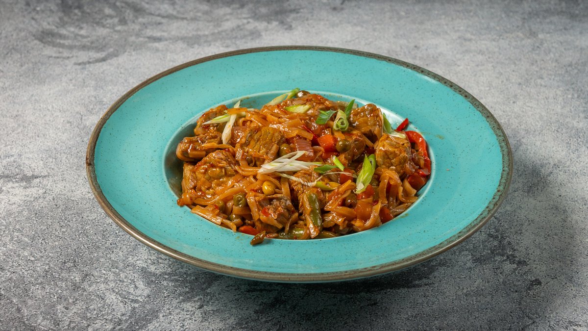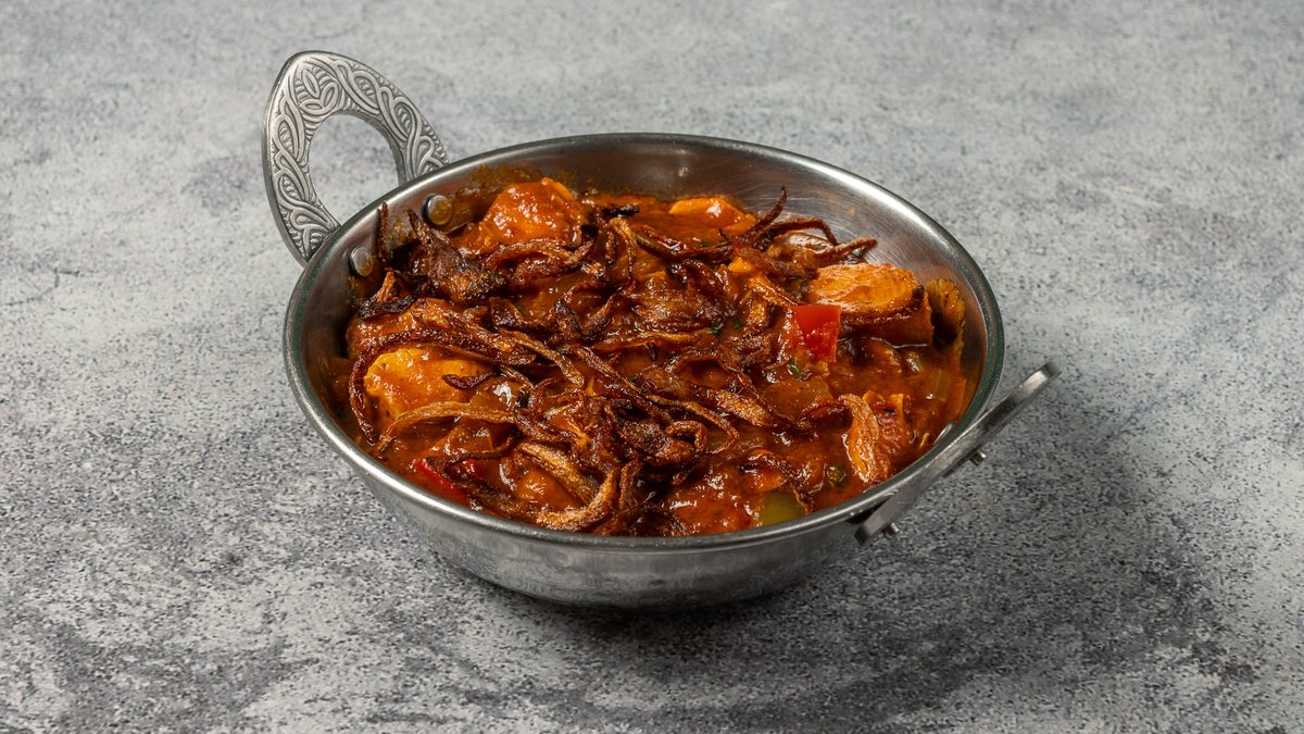 Ένα γαστρονομικός θρίαμβος για τους λάτρεις των κάρυ. Αρκετά πικάντικο, μαγειρεμένο με κρεμμύδια, κομμάτια κόκκινων και πράσινων πιπεριών, πράσινο τσίλι, φρέσκο κρεμμυδάκι και μπαχαρικά σε αρωματική σάλτσα ντομάτας
