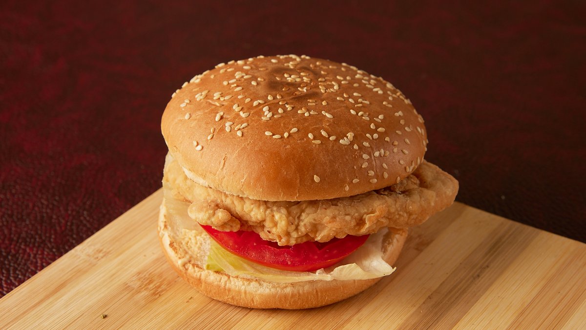 Με ψωμάκι brioche, τηγανητό μπούτι κοτόπουλο, iceberg, ντομάτα και μουστάρδα sause