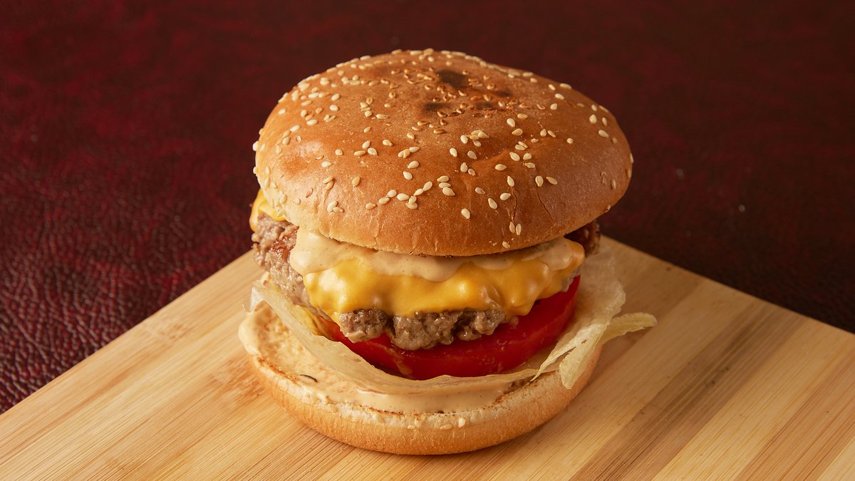 Με μπιφτέκι 150 g, cheddar τυρί, iceberg, ντομάτα και pizza man sauce