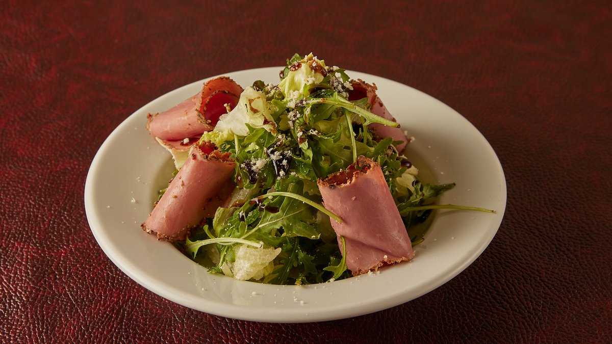 Σαλάτα με ρόκα, μοσχαρίσιο παστράμι, τριμμένη παρμεζάνα κι κρέμα βαλσάμικο
