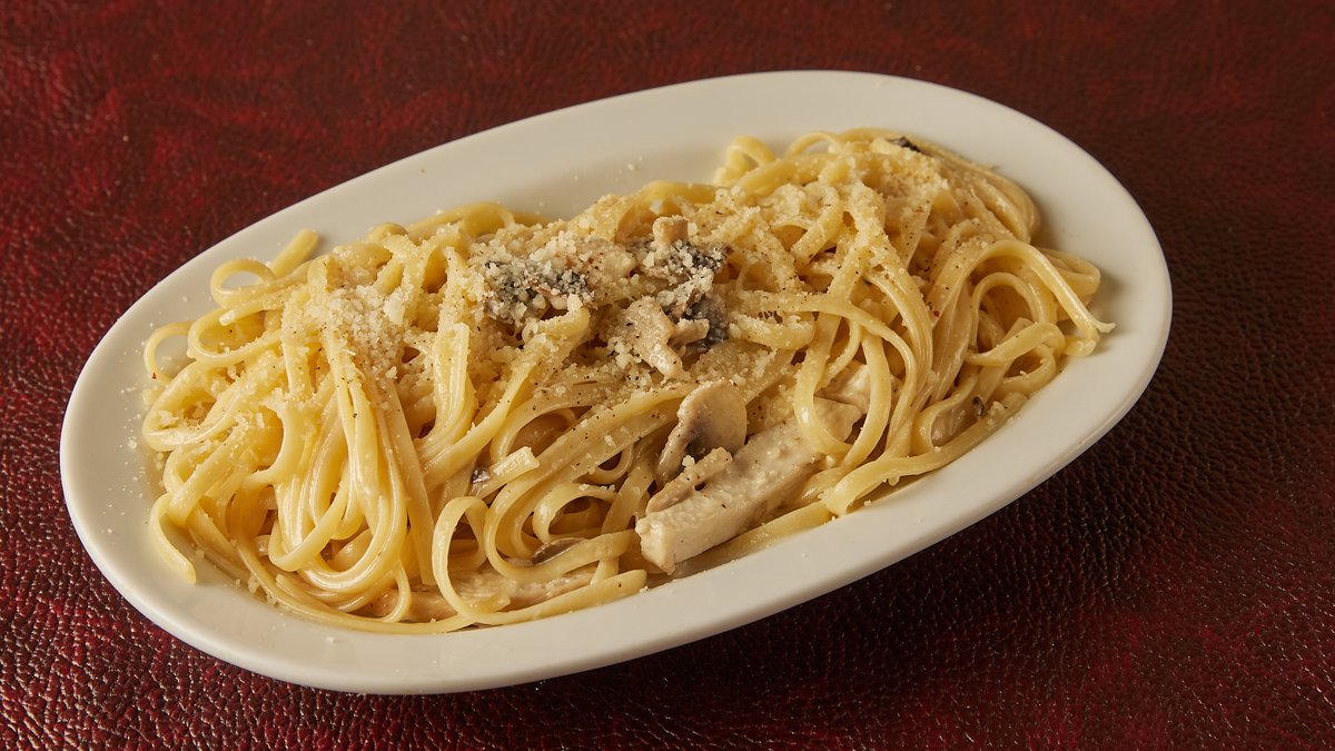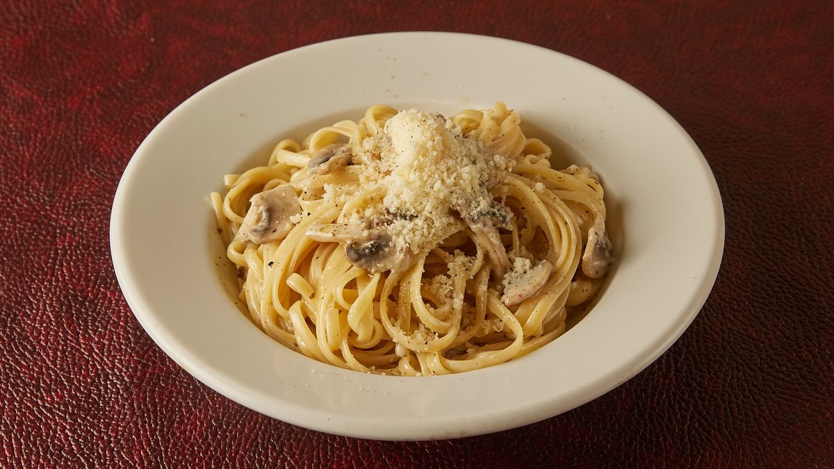 Κοτόπουλο, κρέμα γάλακτος, φρέσκα μανιτάρια, παρμεζάνα. Συνοδεύεται από ψωμάκι