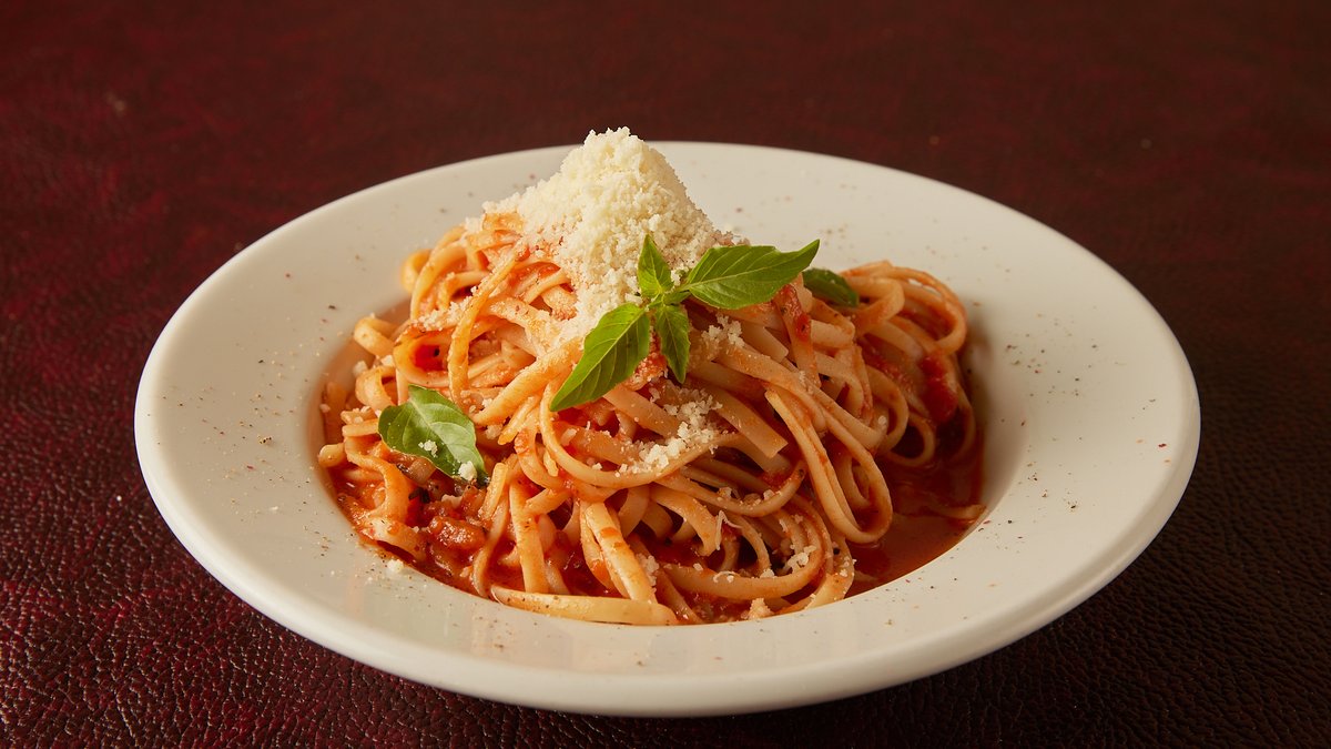 Σάλτσα ντομάτας, μοσχαρίσιοο κιμά, παρμεζάνα. Συνοδεύεται από ψωμάκι