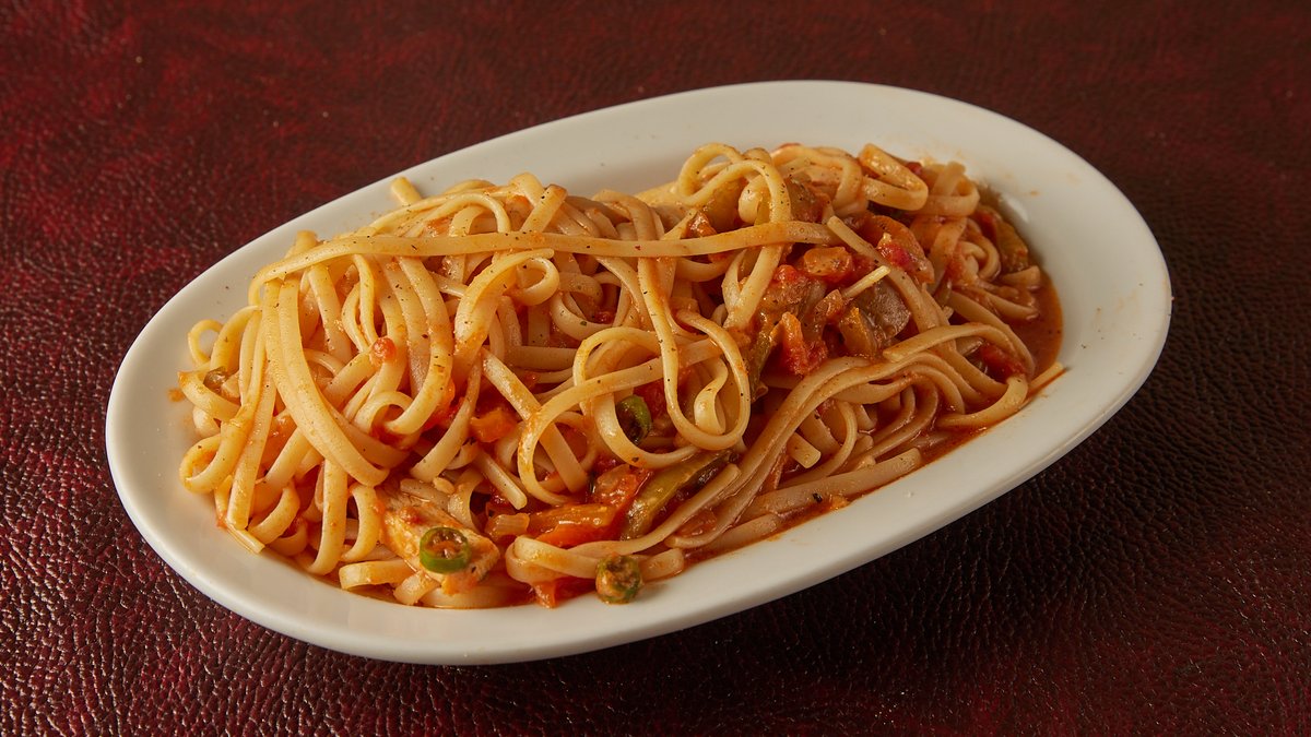 Καυτερή σάλτσα ντομάτας, κοτόπουλο, πιπεριές. Συνοδεύεται από ψωμάκι