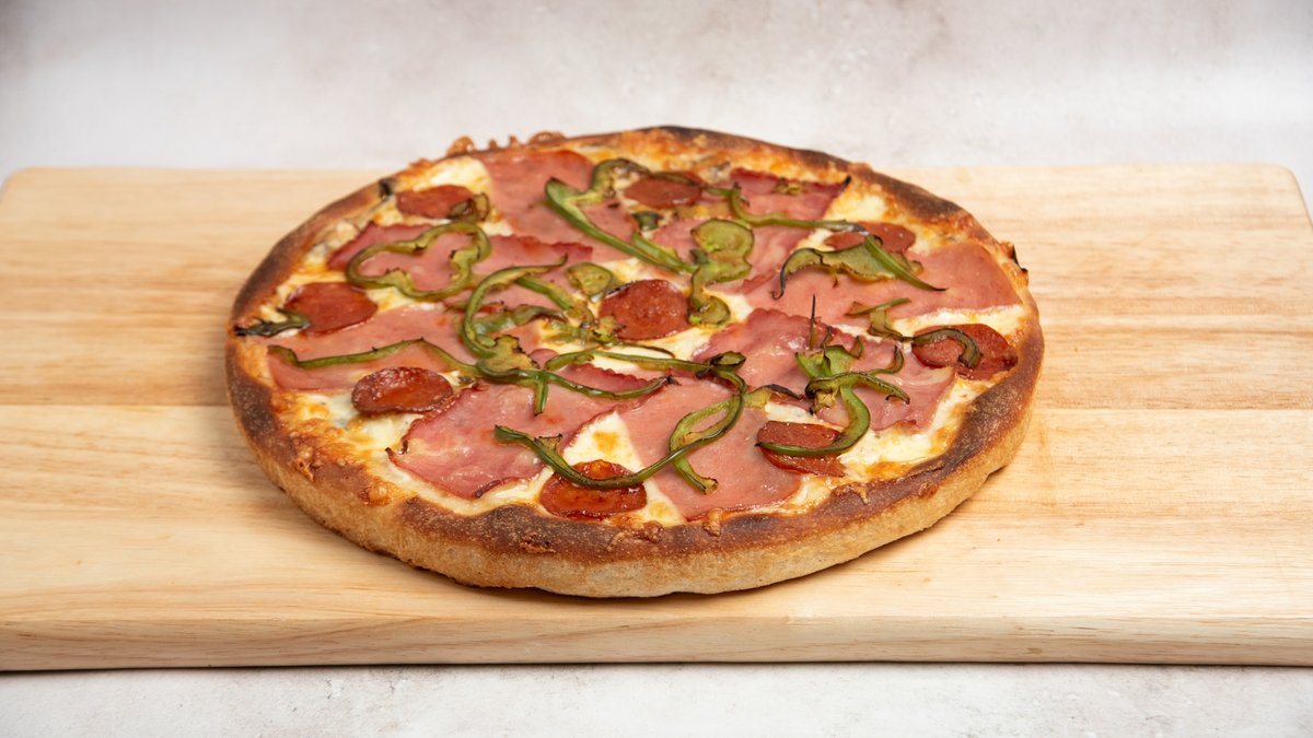 Ζαμπόν, μπέικον, πεπερόνι, μανιτάρια, πιπεριά, γκούντα και μοτσαρέλα