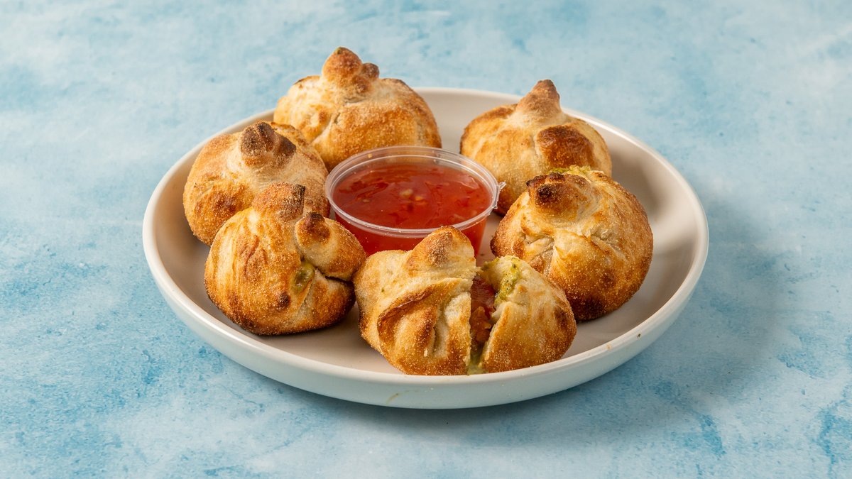 Γεμιστά πουγκιά με mozzarella vegan και pesto. Συνοδεύεται από sweet chili