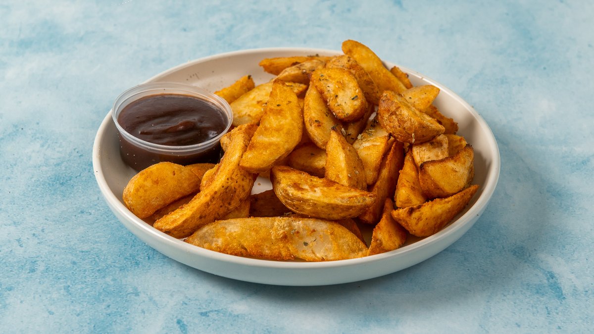 Τραγανές πατάτες στο φούρνο. Συνοδεύεται από BBQ sauce