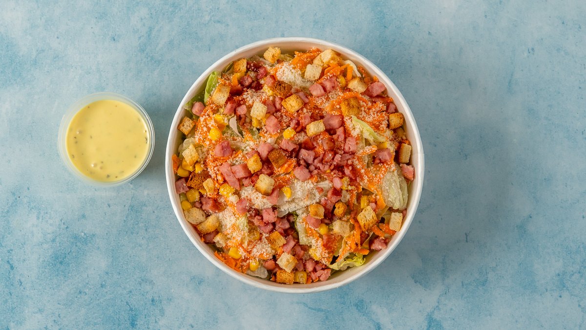 Με φρεσκοψημένη λεπτή ζύμη, caesar σως, κομμένο iceberg, μαρούλι, πιπερόνι, τριμμένη παρμεζάνα και φρέσκια ντομάτα