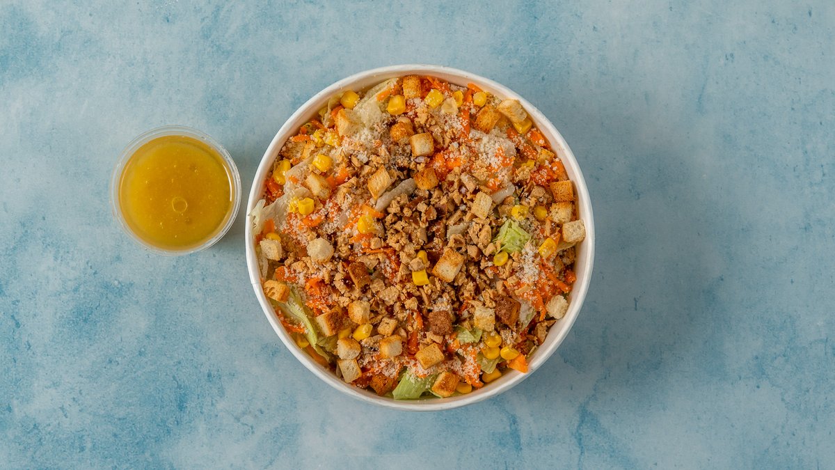 Σαλάτα με μπέικον vegan, παρμεζάνα vegan, iceberg, καρότο, καλαμπόκι, κρουτόν και vinaigrette λεμονιού