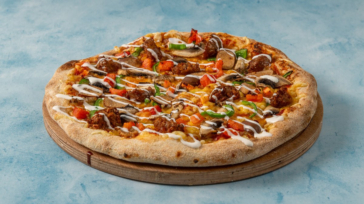 Με σάλτσα bite, vegan mozzarella, vegan pepperoni, λουκάνικο beyond, μανιτάρια φρέσκα, πιπεριά πράσινη, φρέσκια ντομάτα και vegan μαγιονέζα