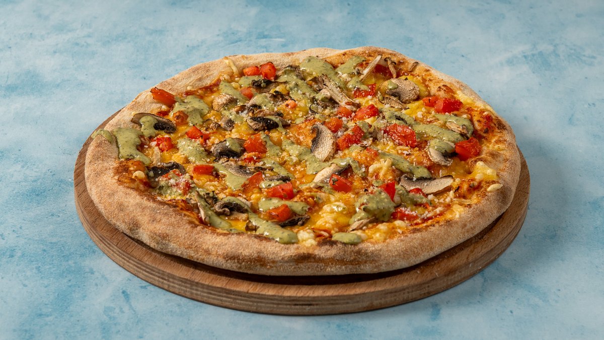 Με σάλτσα ψημένου κρεμμυδιού, μοτσαρέλα vegan, μανιτάρια και πιπεριά πράσινη
