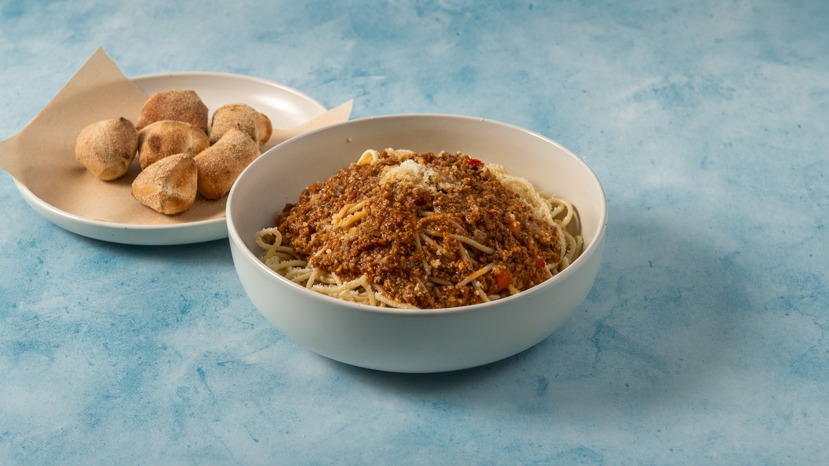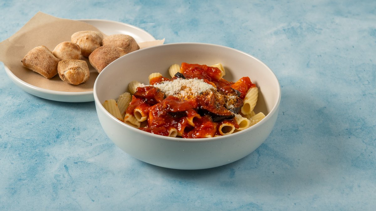 Με μυρωδάτη σάλτσα από φρέσκες ντομάτες, με βασιλικό και θυμάρι. Συνοδεύεται από 6 μπουκίτσες φρεσκοψημένης ζύμης και παρμεζάνα vegan (χωρίς λακτόζη και γλουτένη)