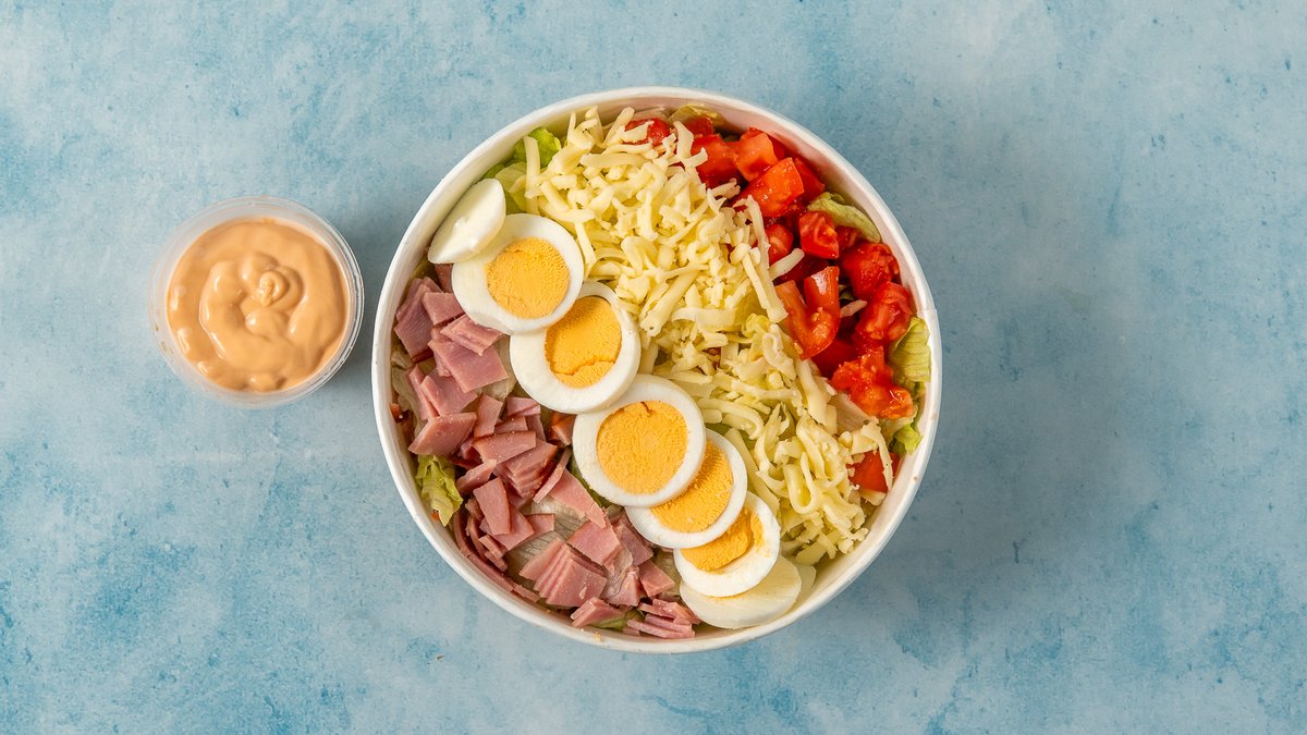 Με sauce cocktail, μοτσαρέλα, gouda, μπέικον, πατάτες και αυγό