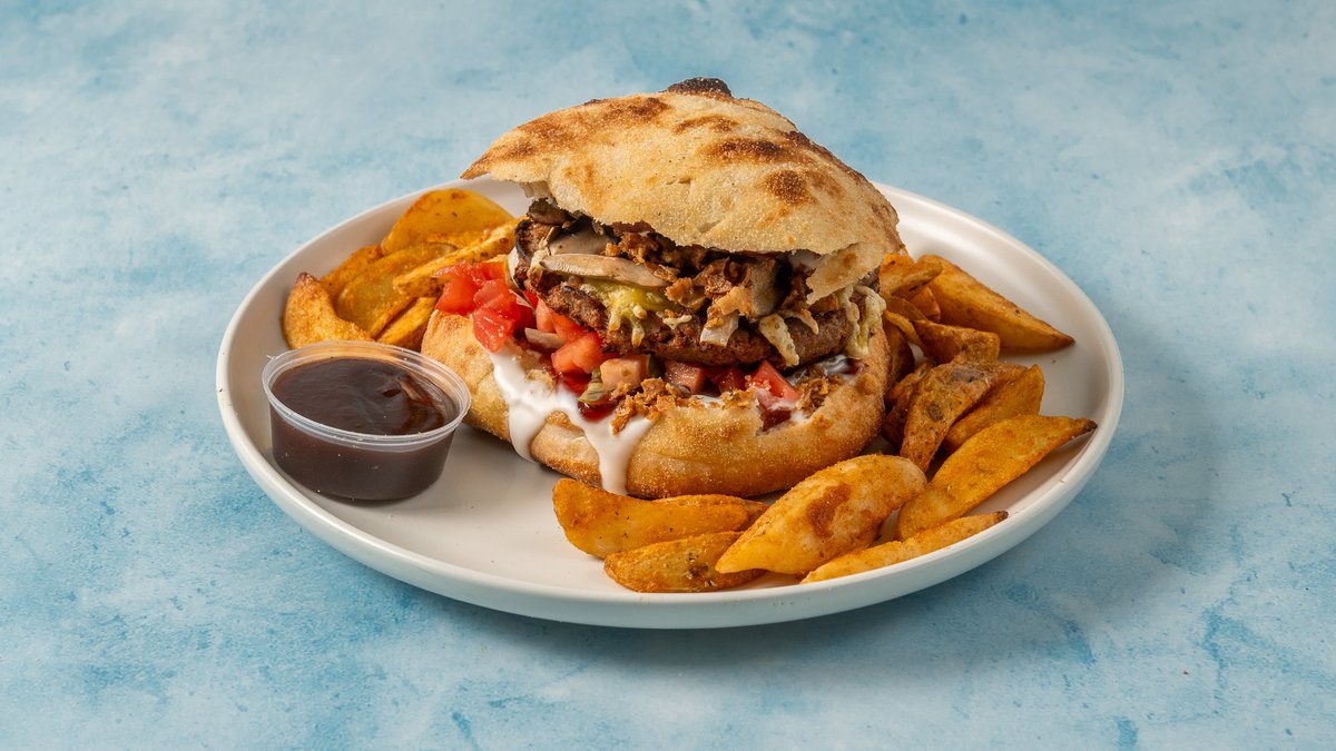 Αφράτo ψωμί με beyond sausages, μανιτάρια φρέσκα, vegan μπέικον, vegan cheddar σως και iceberg. Συνοδεύονται από χωριάτικες πατάτες φούρνου