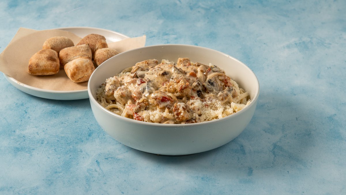 Με κρέμα γάλακτος vegan, μανιτάρια και μπέικον vegan.Συνοδεύεται από 6 μπουκίτσες φρεσκοψημένης ζύμης και παρμεζάνα vegan (χωρίς λακτόζη και γλουτένη)