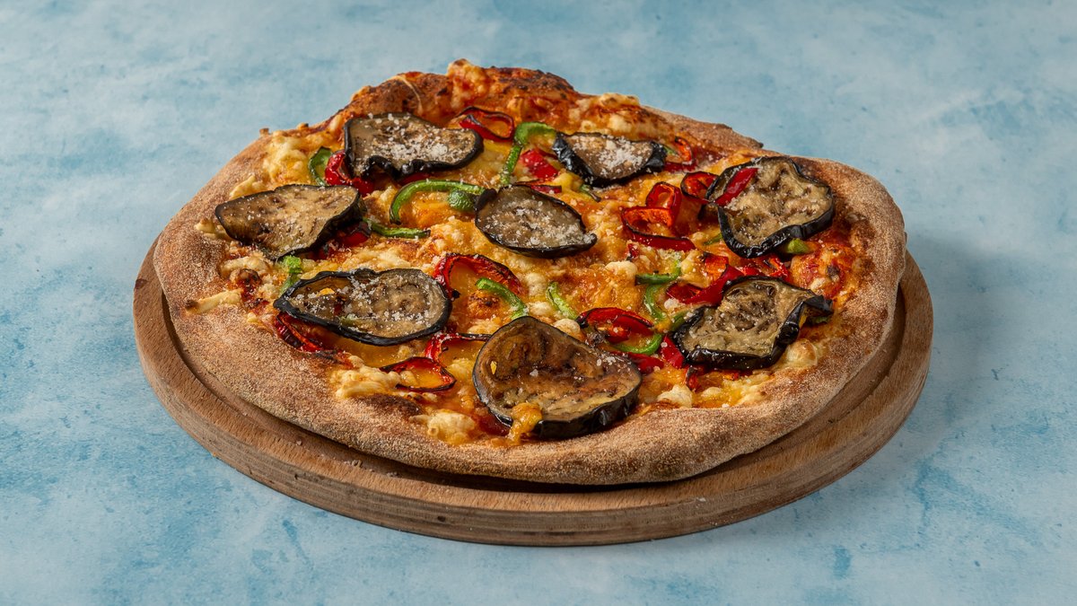 Με κόκκινη ελαφριά σάλτσα από ντοματίνια, μελιτζάνες μαριναρισμένες σε ελαιόλαδο, ντοματίνια, vegan παρμεζάνα και vegan pesto βασιλικού. Συνοδεύεται από 6 μπουκίτσες φρεσκοψημένης ζύμης και τυρί παρμεζάνα ή παρμεζάνα vegan