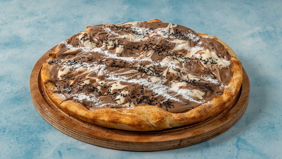 Με ιταλική λεπτή ζύμη, σάλτσα bite, ανθότυρο Κρήτης, πιπεριά και ντομάτα, κρεμμύδι, αρωματισμένη με λάδι πιπεριού