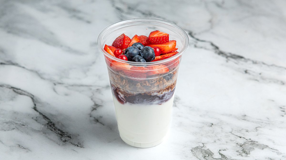 Με μαρμελάδα φράουλα, φράουλα, flakes καρύδας, goji berry, cranberry, blueberries και ganola
