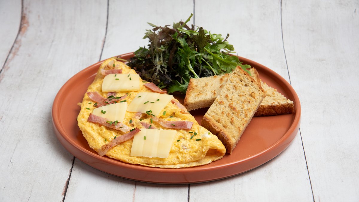 Με 3 αυγά ελευθέρας βοσκής, μπέικον και γραβιέρα. Συνοδεύεται από mix πράσινη σαλάτα αρωματική