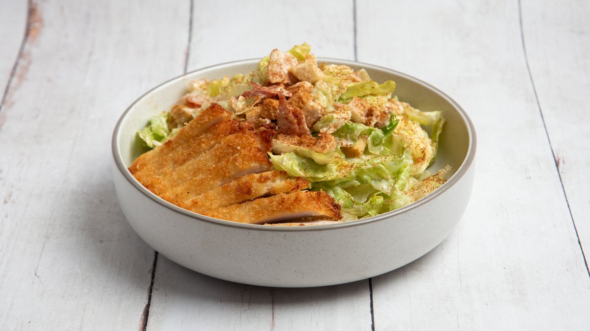 Σαλάτα με παναρισμένο φιλέτο κοτόπουλο, μπέικον, προζυμένια κρουτόν και παρμεζάνα
