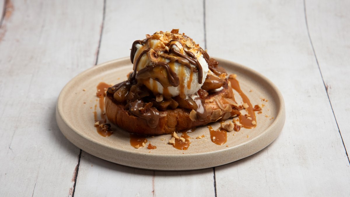 Με μήλο καραμελωμένο, πραλίνα σοκολά, παγωτό βανίλια και σάλτσα αλμυρής καραμέλας