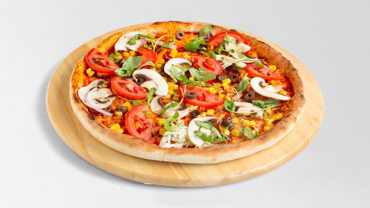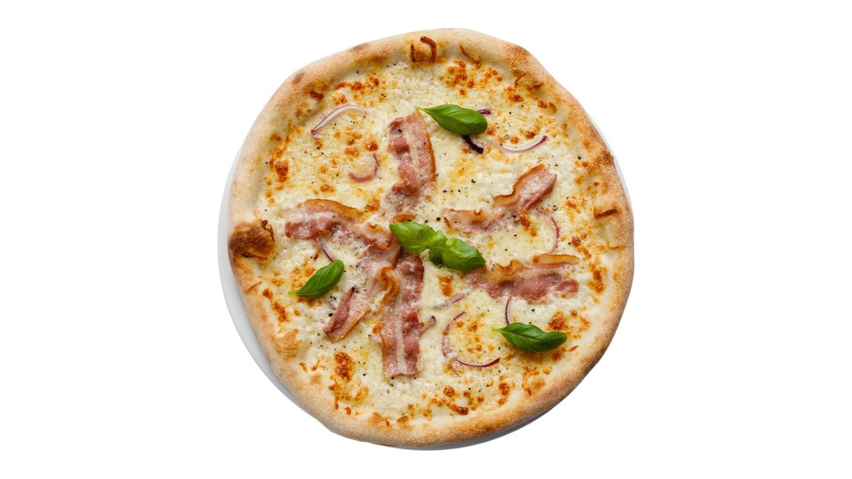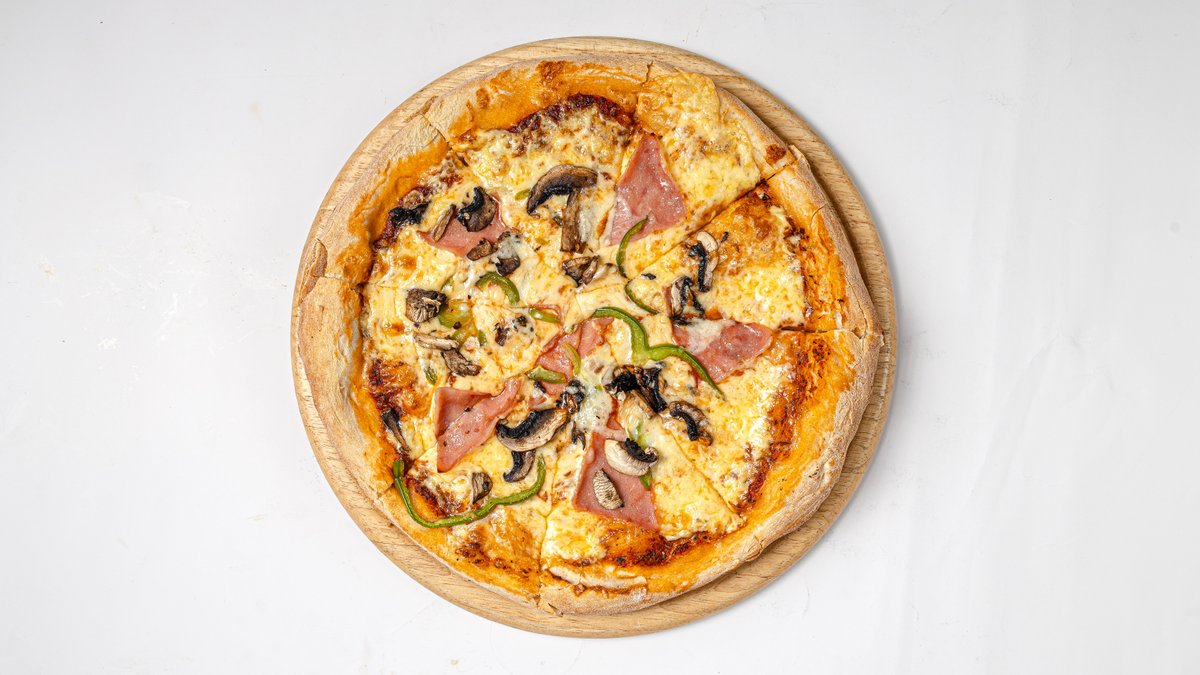 With tomato sauce, mozzarella, ham, pepperone, pancetta, mushroom and pepper