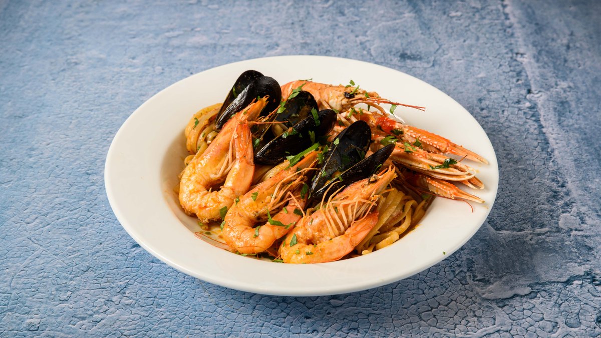 Λιγκουίνι με ποικιλία από όστρακα και μυρωδικά σε σάλτσα ντομάτας