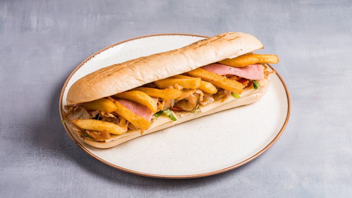 Συνοδεύεται από ντομάτα, μαρούλι, πατάτες τηγανητές, σως chicken και πίτα