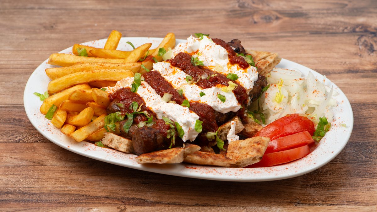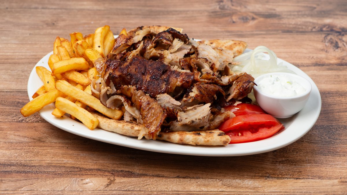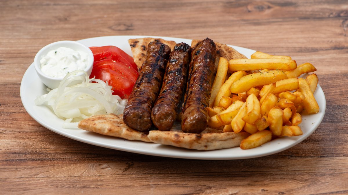 3 Τεμάχια. Συνοδεύεται από ντομάτα, κρεμμύδι, πατάτες τηγανητές και γιαούρτι