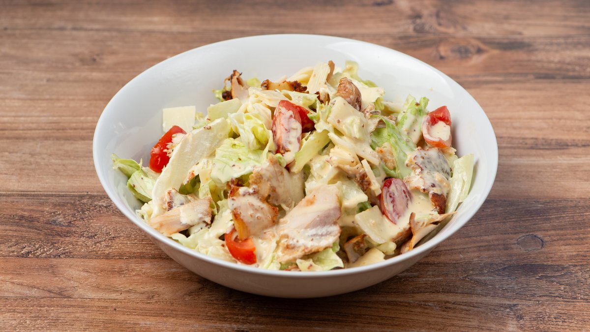 Σαλάτα με iceberg, γύρο κοτόπουλο, κρουτόν, παρμεζάνα και Caesar`s sauce
