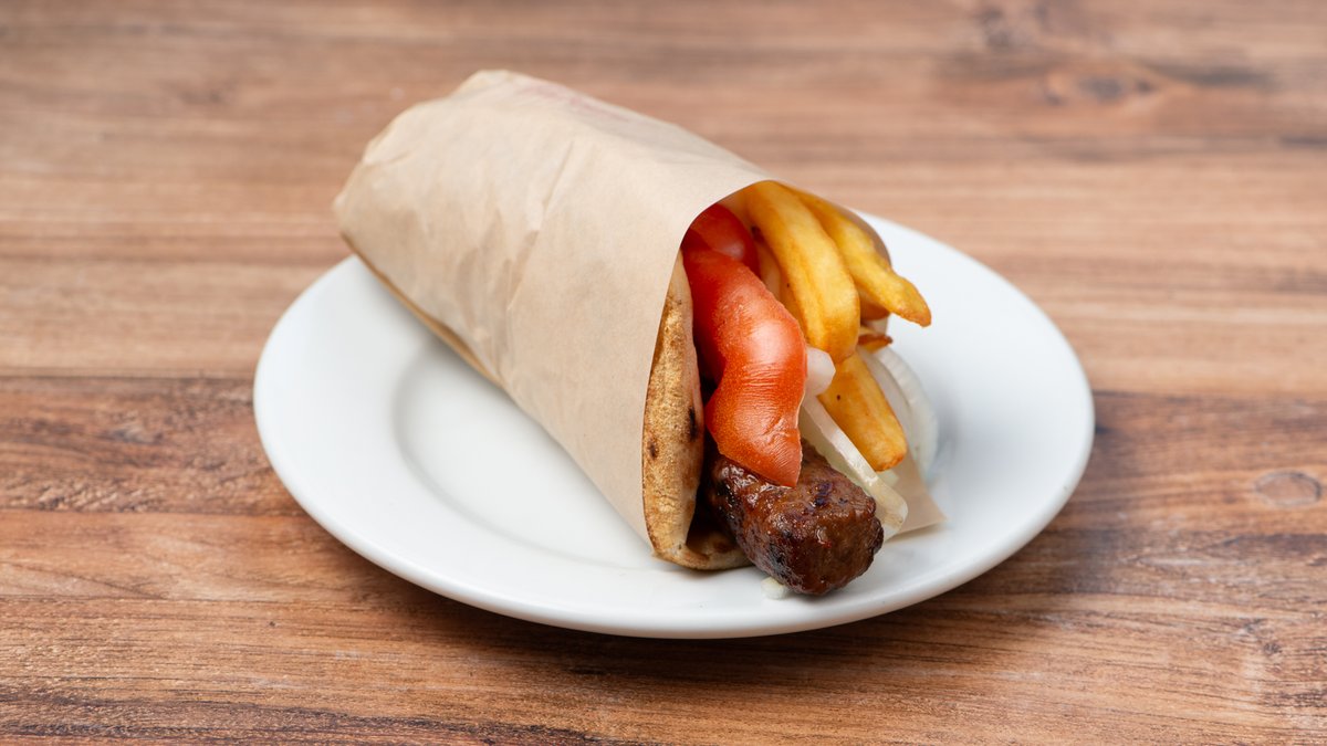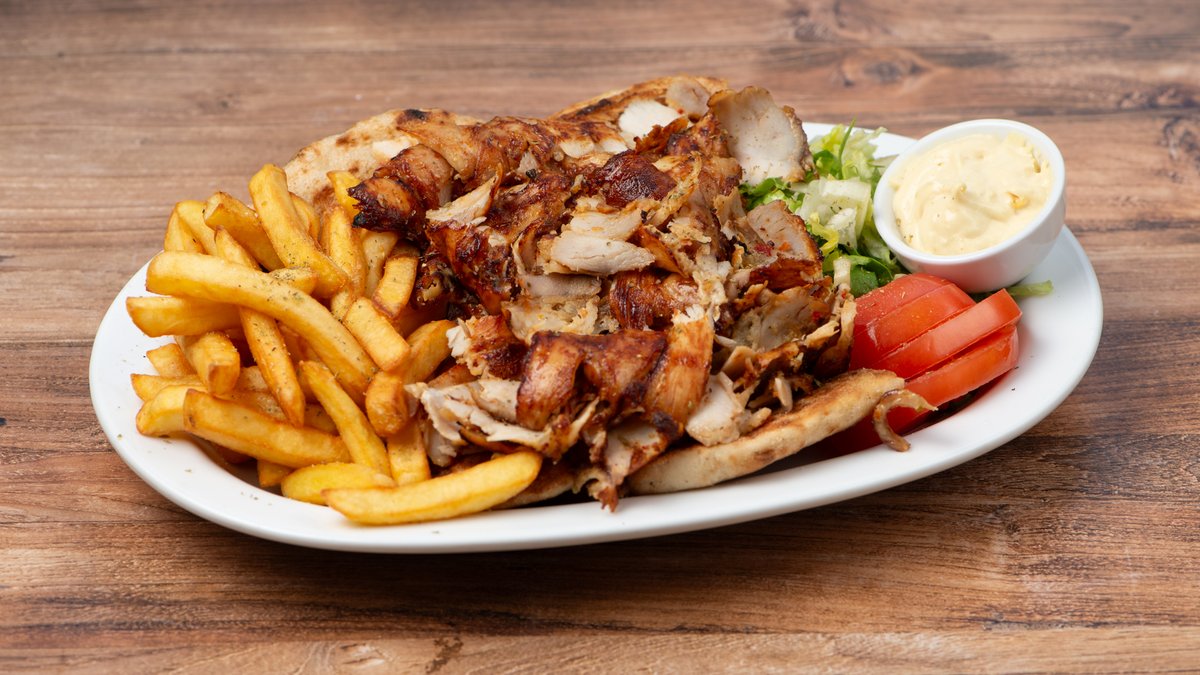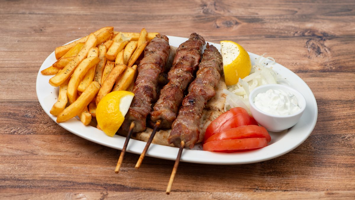 3 Τεμάχια. Συνοδεύεται από ντομάτα, κρεμμύδι, πατάτες τηγανητές, τζατζίκι και 1 πίτα