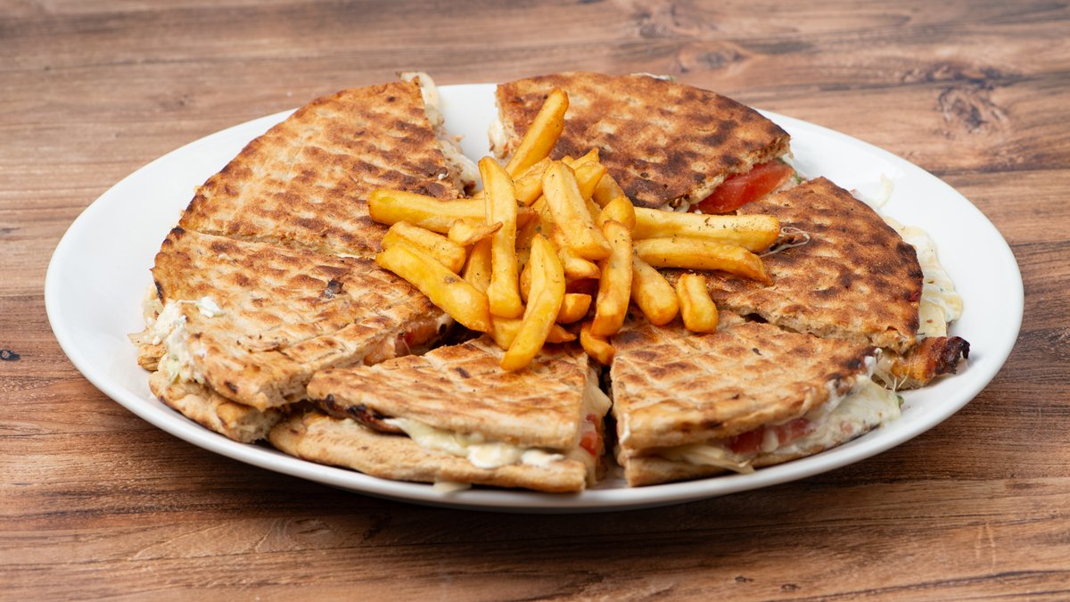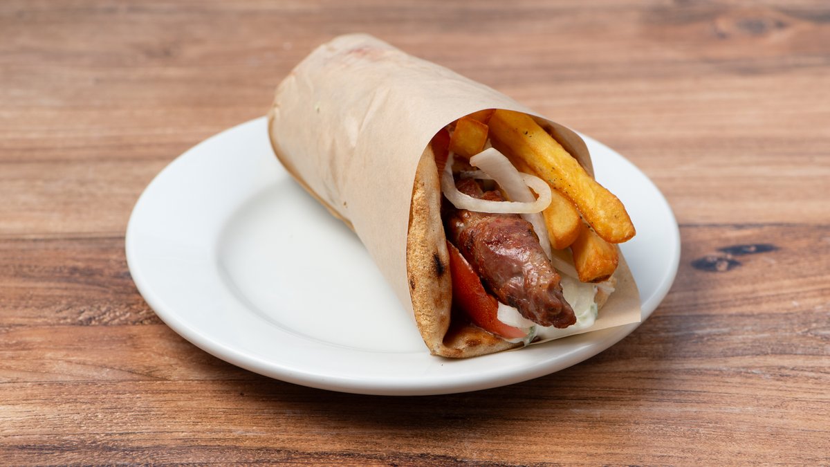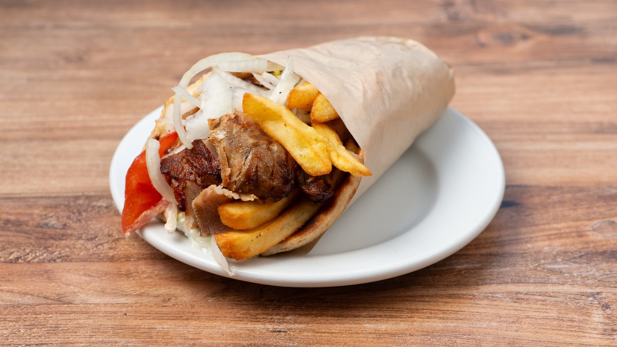 Φεγγαρόπιτα γύρος ανάμεικτος με τα υλικά της επιλογής σου. Συνοδεύεται από πατάτες τηγανητές