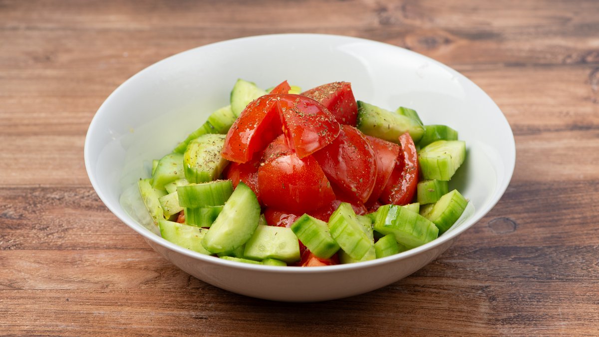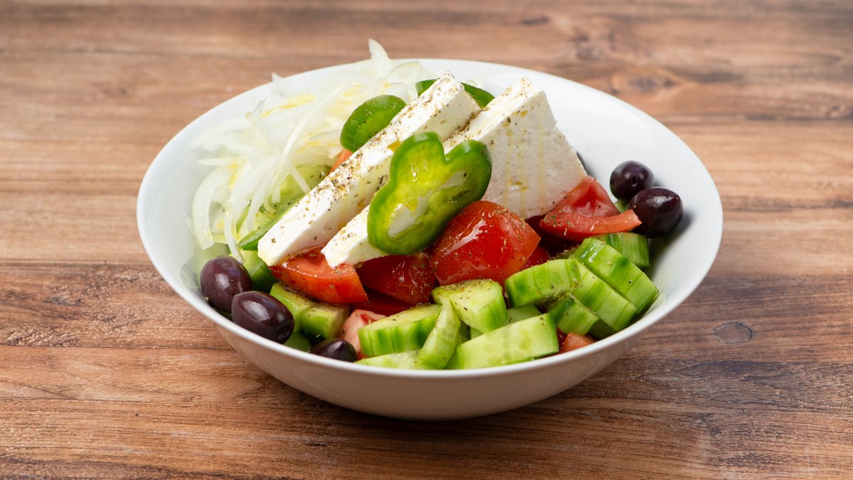 Σαλάτα με ντομάτα, αγγούρι, κρεμμύδι, πιπεριά πράσινη, ελιές, φέτα και extra παρθένο ελαιόλαδο