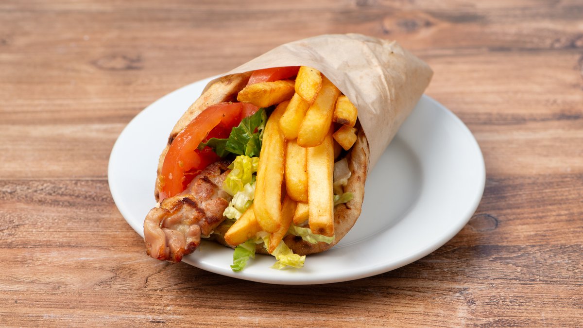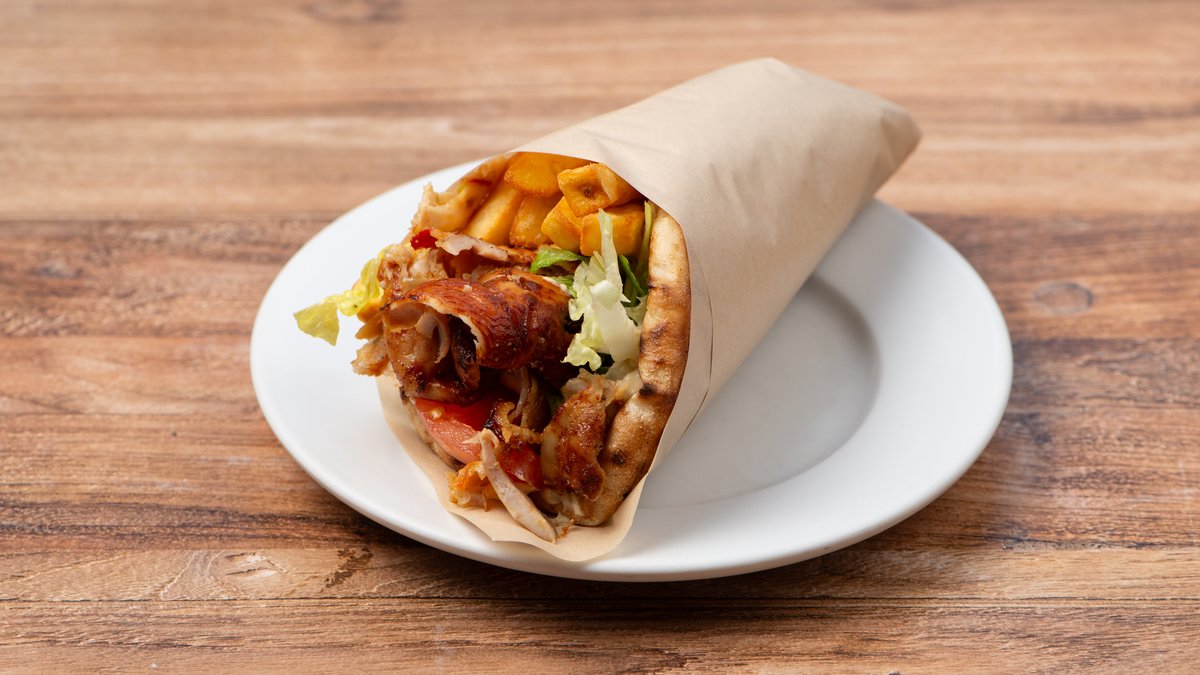 Σκεπαστή γύρος κοτόπουλο με τα υλικά της επιλογής σου. Συνοδεύεται από πατάτες τηγανητές