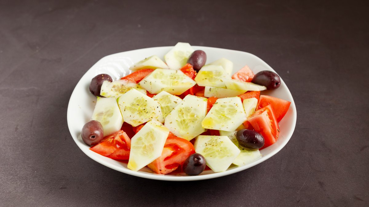 Σαλάτα με αγγούρι, ντομάτα, κρουτόν, ντοματίνια και ελιές