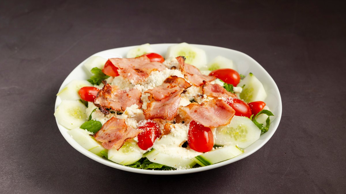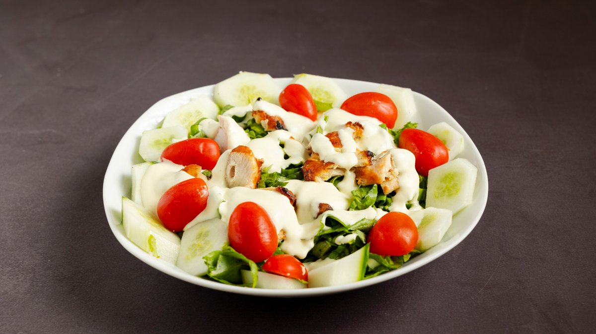 Σαλάτα με ντομάτα, αγγούρι, μαρούλι ντοματίνια, παρμεζάνα, φιλέτο κοτόπουλο, μπέικον κρουτόν και Caesar`s σως