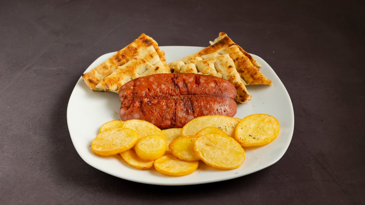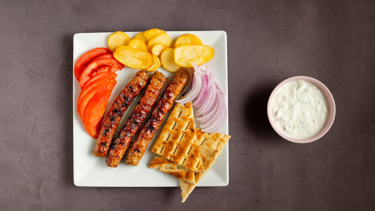 Συνοδεύεται από πατάτες τηγανητές, ντομάτα, κρεμμύδι, τζατζίκι και 2 πίτες