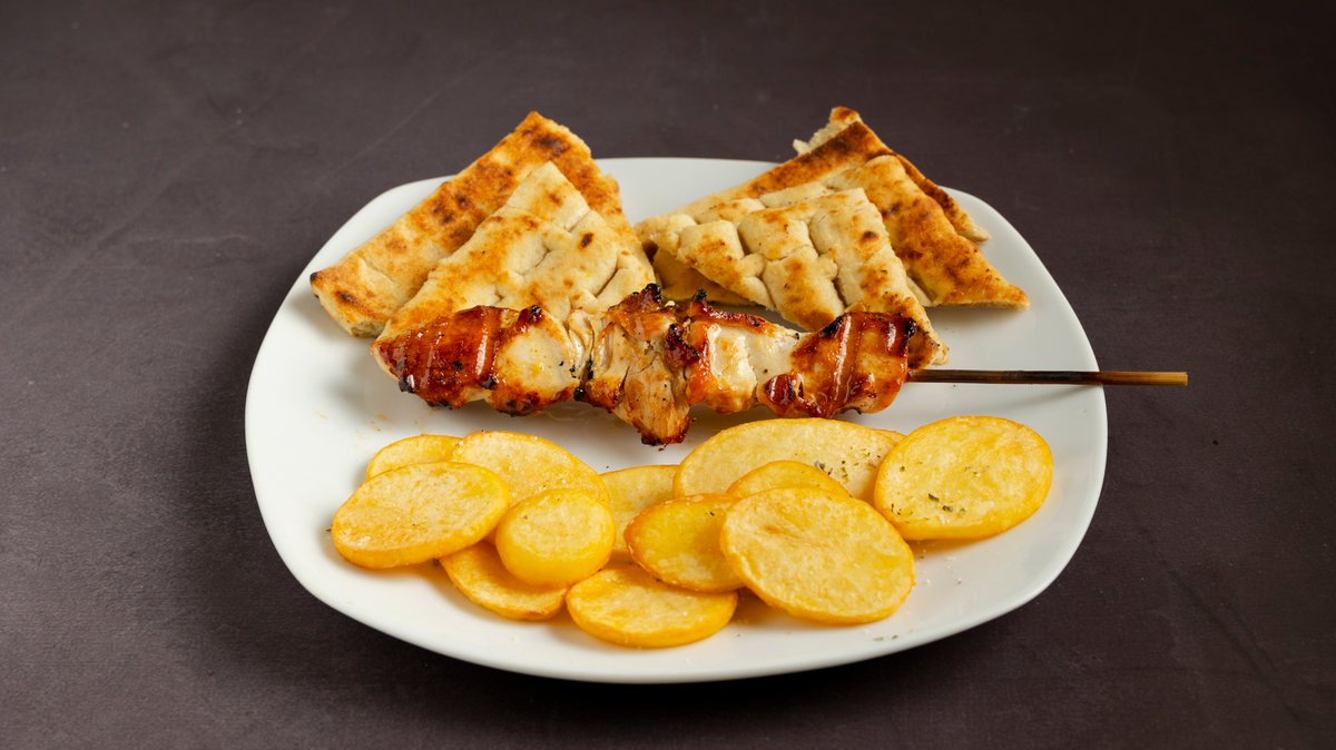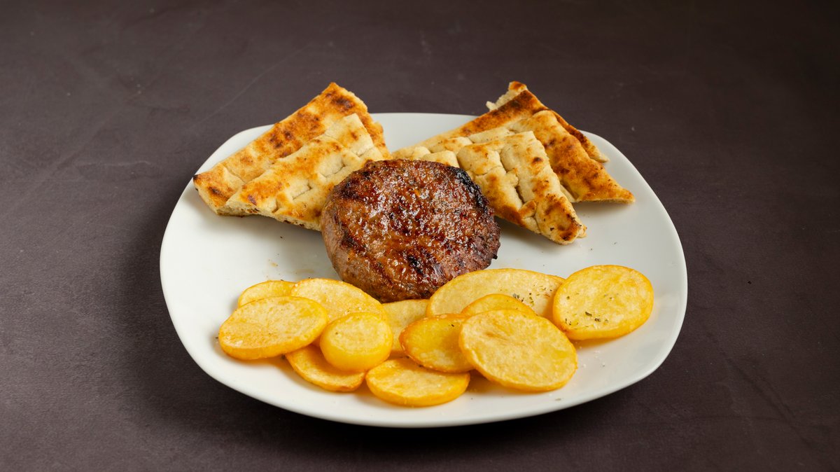 3 Τεμάχια των 120g. Συνοδεύεται από πατάτες τηγανητές, ντομάτα, κρεμμύδι, τζατζίκι και 2 πίτες
