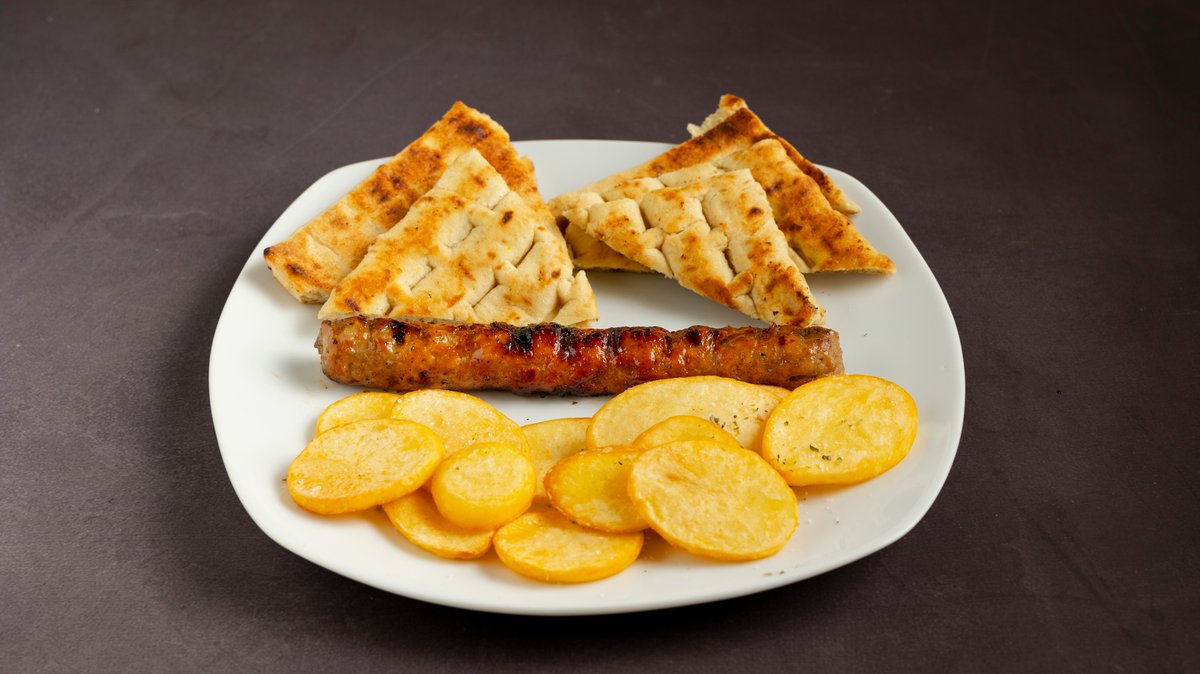 Χειροποίητο. Συνοδεύεται από πατάτες τηγανητές και πίτα