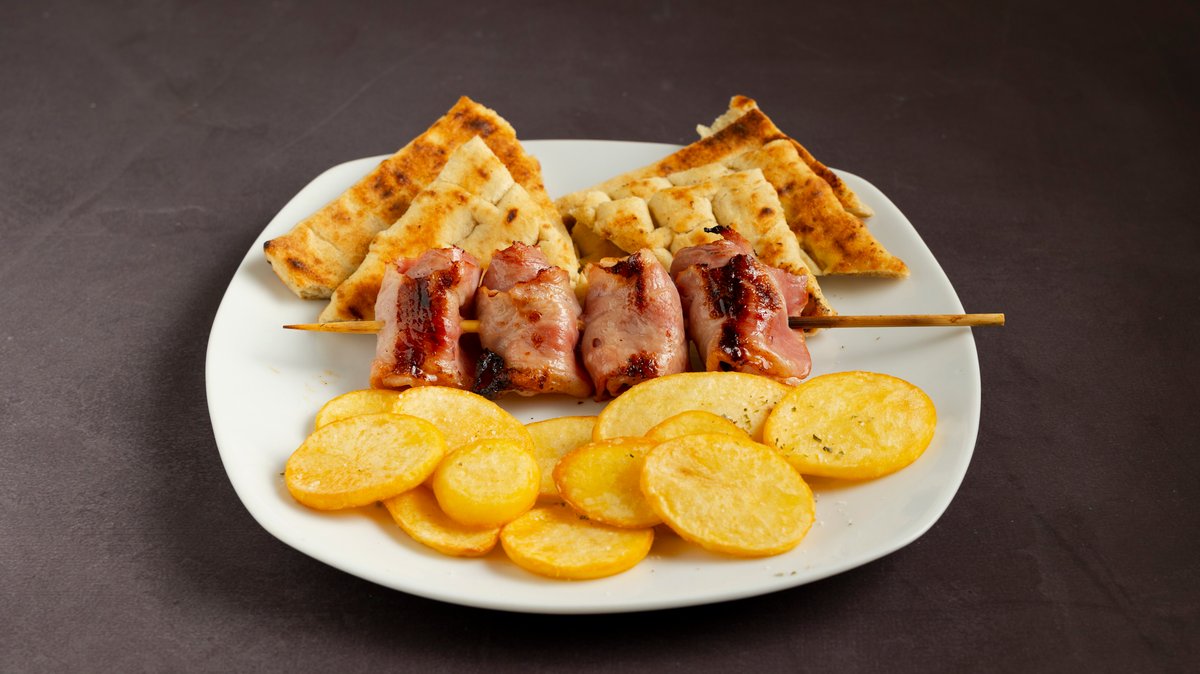 Για 4 άτομα. Με 2 μπριζολοκάλαμα, 2 κοτομπέικον, 2 καλαμάκια κοτόπουλο, 2 λουκάνικα χωριάτικα, 2 κεμπάπ, γύρο χοιρινό και γύρο κοτόπουλο. Συνοδεύεται από πατάτες τηγανητές, ντομάτα, κρεμμύδι, μαρούλι, σως μουστάρδας, τζατζίκι και 2 πίτες