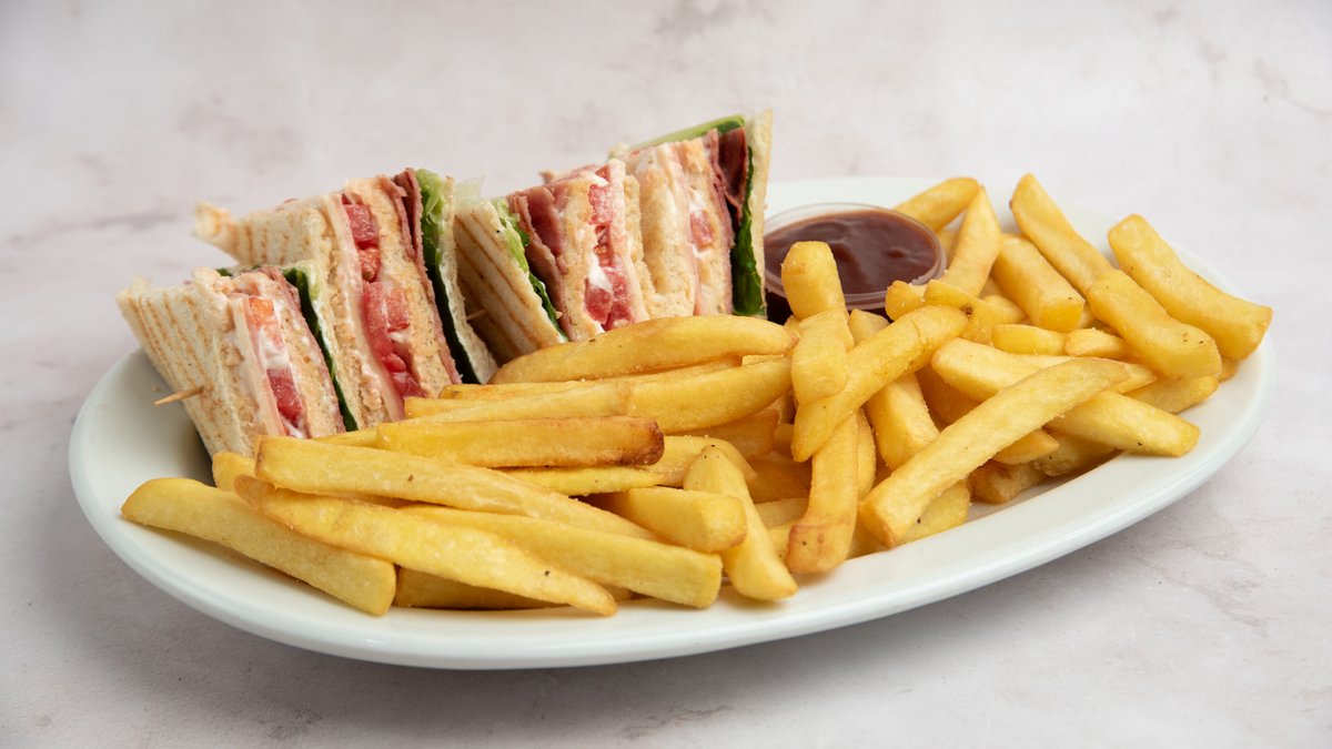 With ham, bacon, gouda, tomato, lettuce, mayonnaise. Served with french fries and ketchup sauce