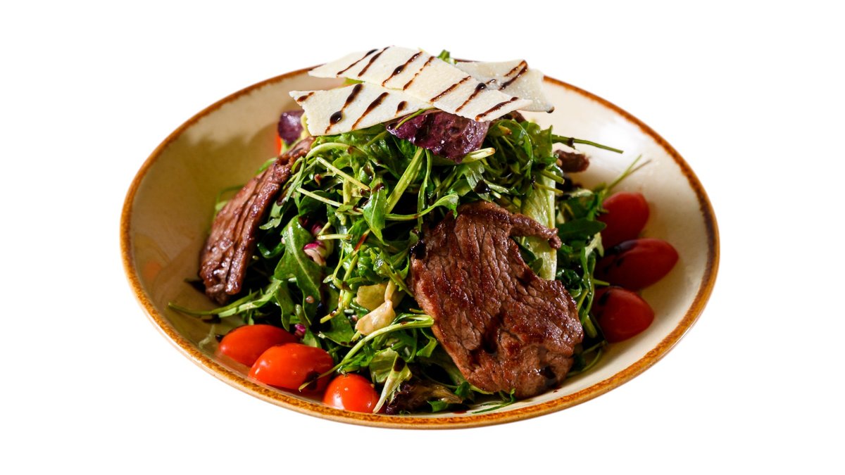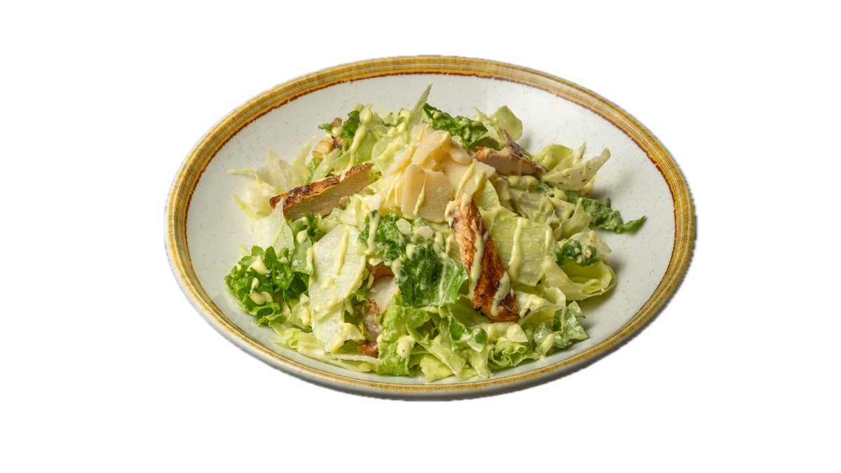 Σαλάτα με λόλα, ρόκα, αγγούρι, μαρούλι, ντοματίνια, κρεμμύδι, κοτόπουλο πακόρα, ελαιόλαδο και dressing mango