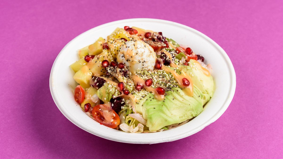 Hawaiian Poke with double bio avocado, goma wakame, edamame, fresh pineapple, beetroot, sunomono cucumber, cherry tomatoes, toasted sesame, corn, steam rice, onion flakes and avococo sauce. 660 g (approx. 390 kcal, 28 g protein)