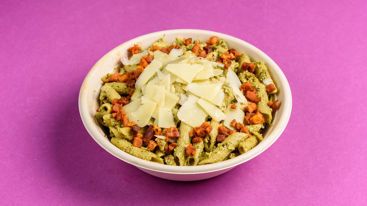 Fusion Pasta with Whole Wheat Penne, Grilled Chicken Fillet, Parmesan, Bacon, Homemade Pesto Genovese, and Homemade Original Caesar's Dressing. 550g (approximately 450 kcal, 20g protein).