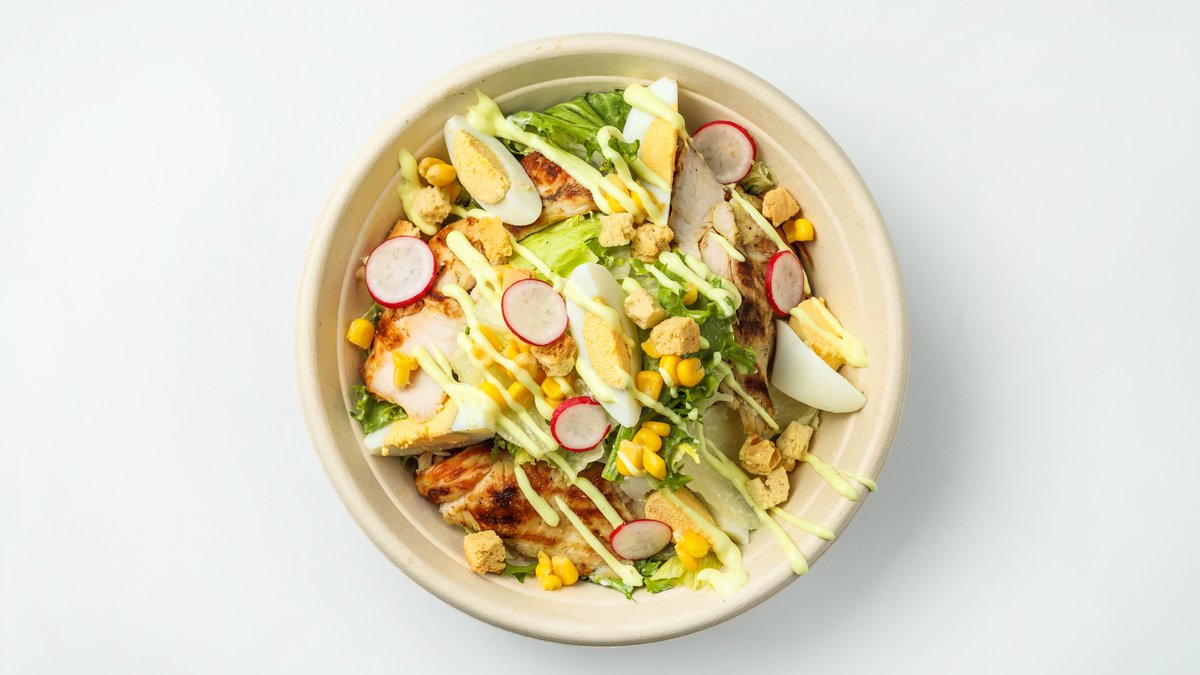 Σαλάτα με μαρούλι, λόλα, ραντίτσιο, κρουτόν, καρότο, παρμεζάνα, καλαμπόκι, φιλετάκια κοτόπουλου και σως μουστάρδας