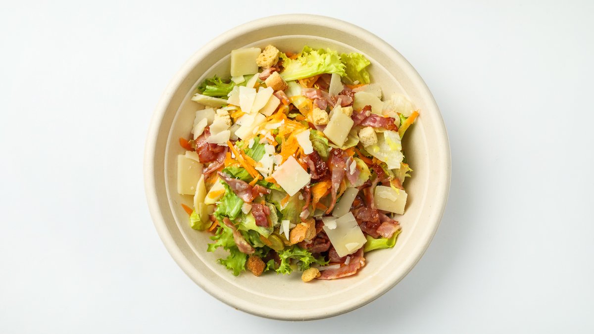 Σαλάτα με μαρούλι, λόλα, ραντίτσιο, καρότο, κρουτόν, παρμεζάνα, μπέικον και σως vinaigette