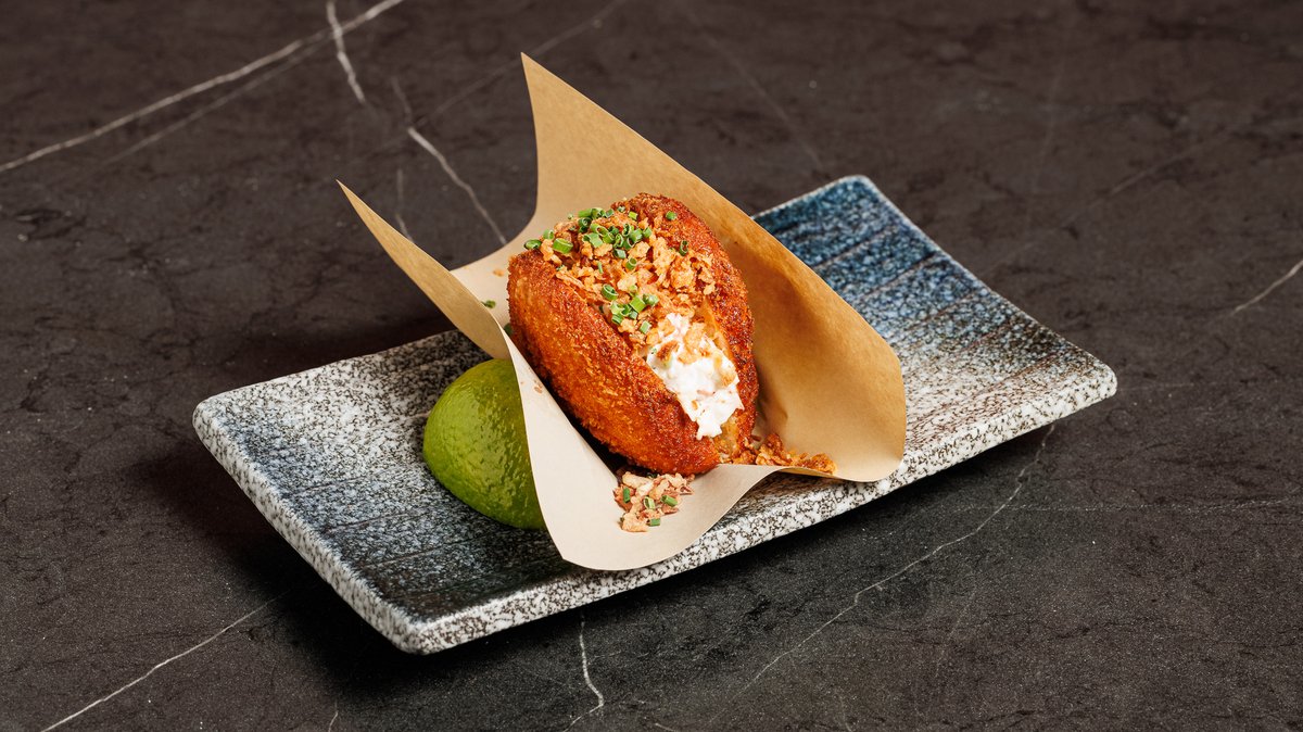 Τηγανητή γαρίδα, αυγά χελιδονόψαρου και spicy mayo