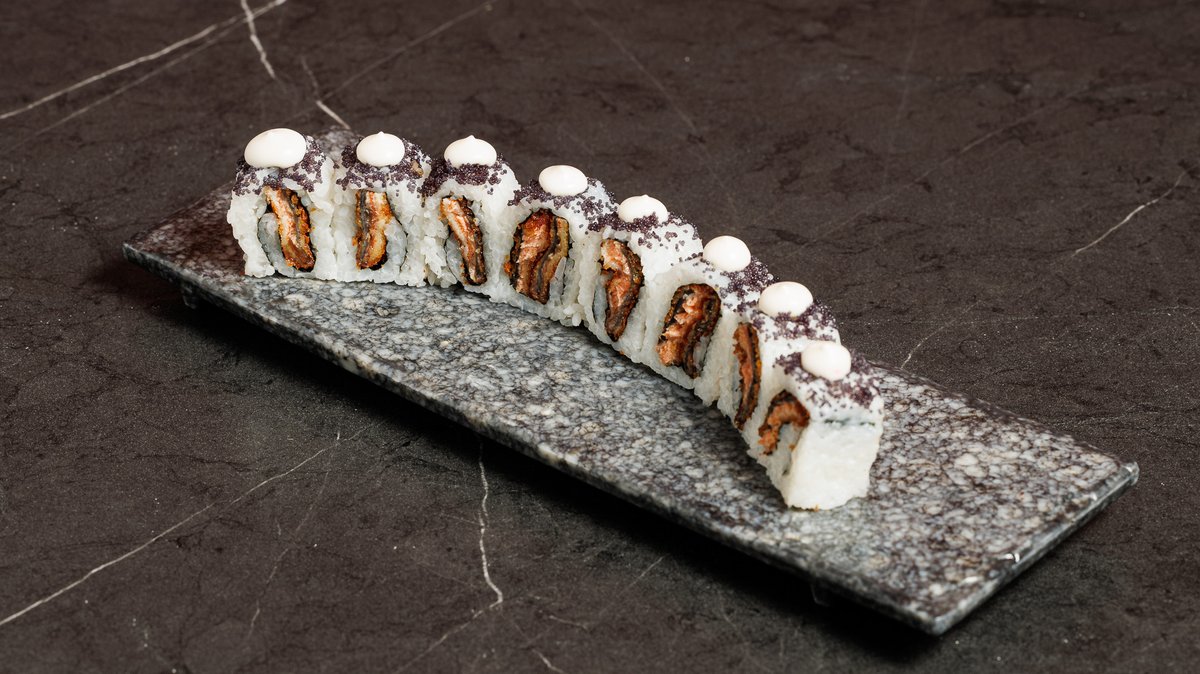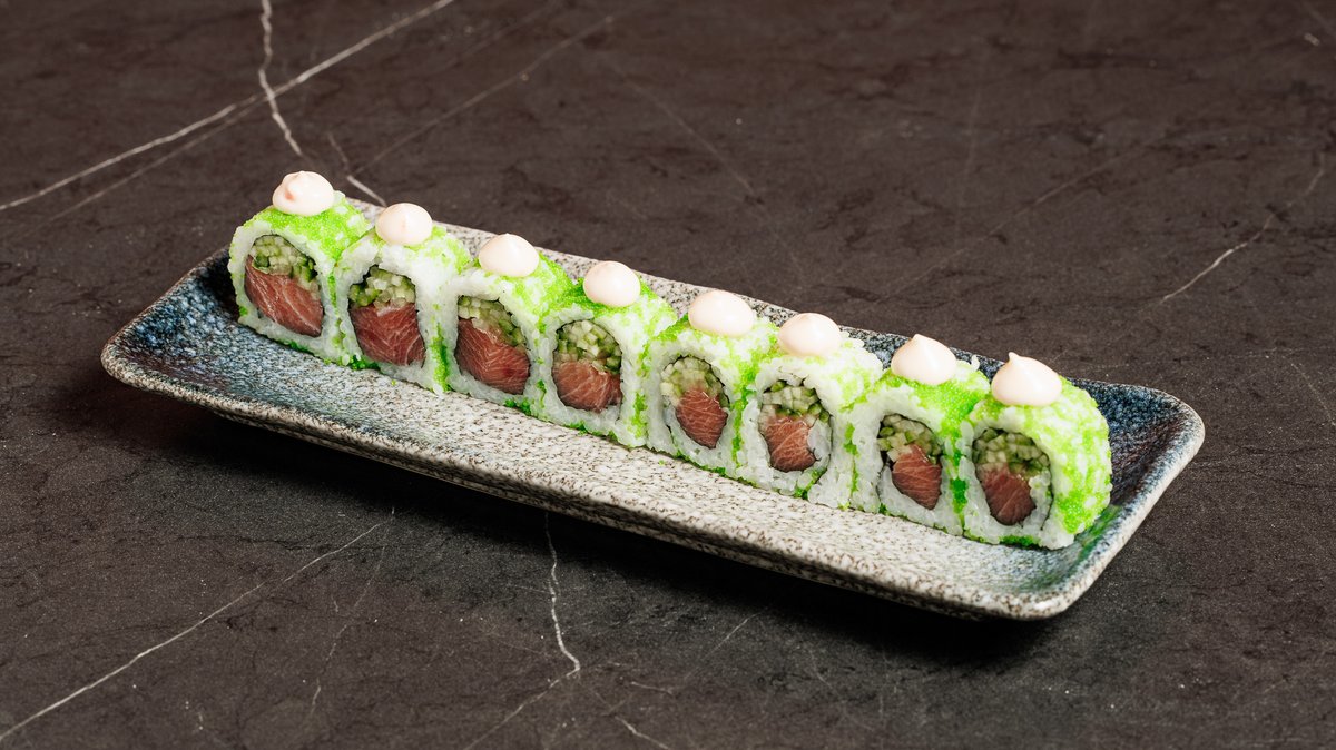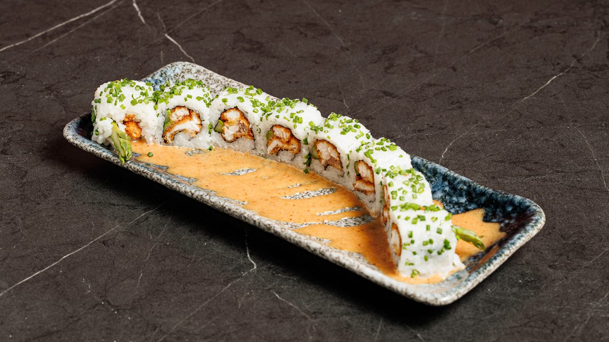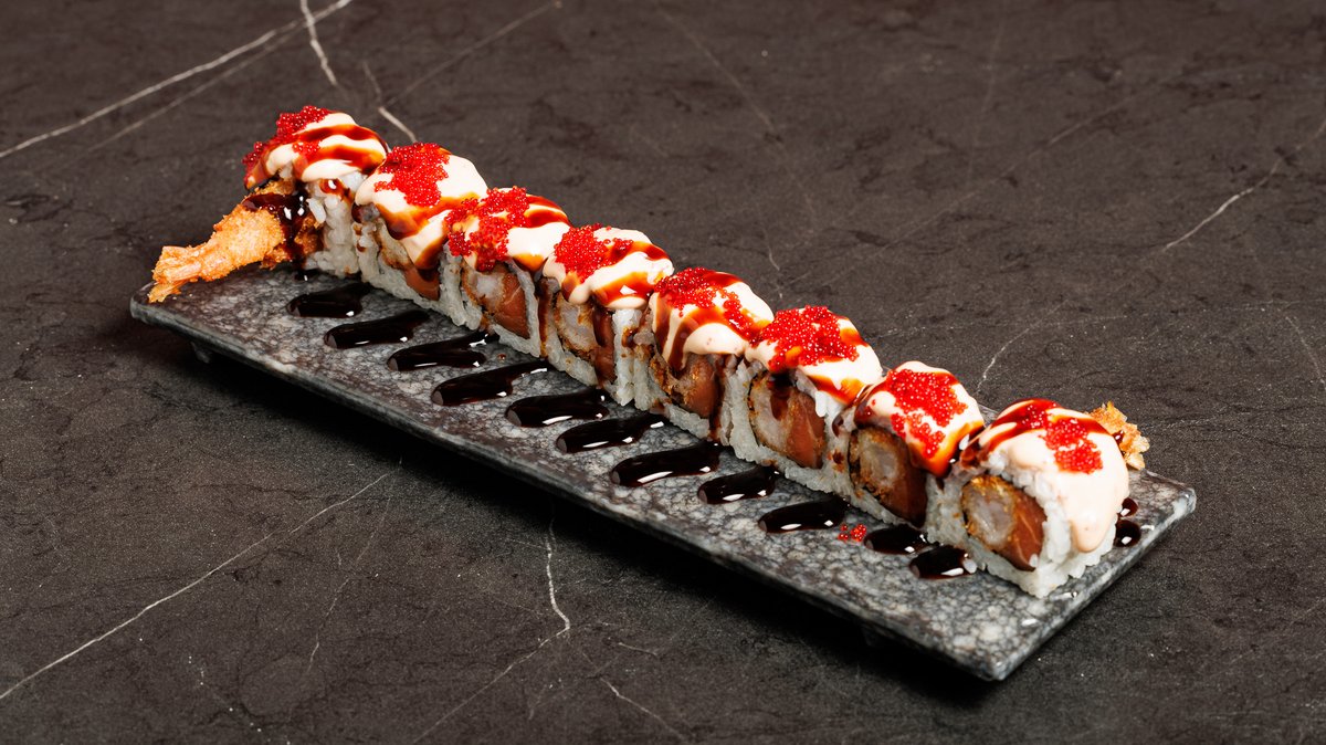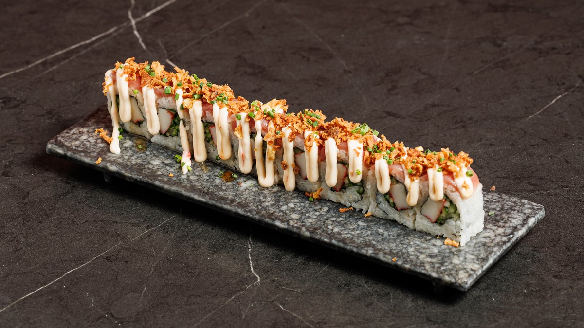 Με σολομό, surimi καβουριού, αγγούρι, spicy mayo, σχοινόπρασο, crispy onions και caramel glaze
